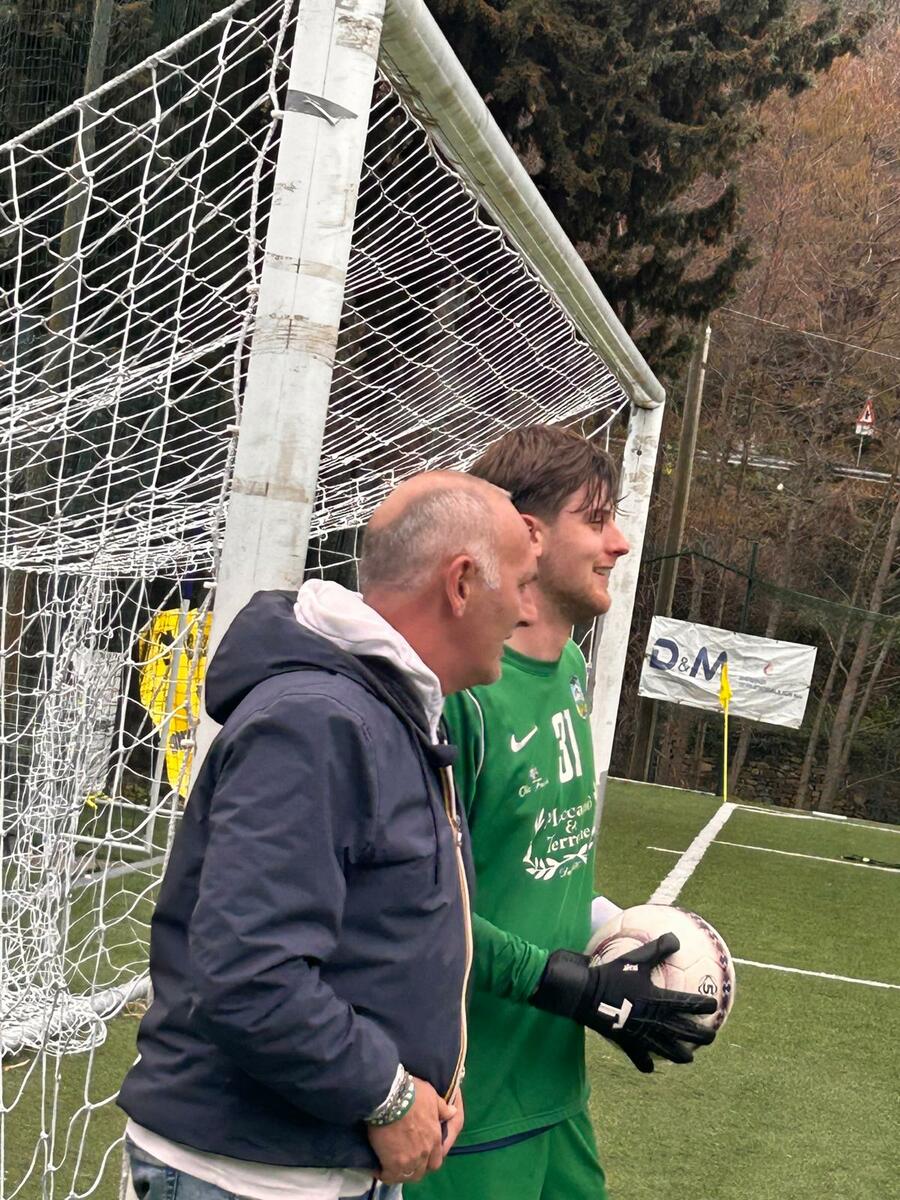 (Il DS Andrea Comiotto, ex portiere, dispensa consiglia a Samuele Meda all’esordio fra i pali)