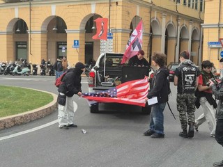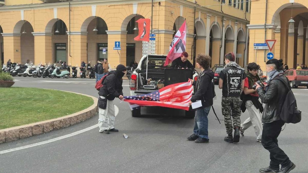 Durante la manifestazione, in piazza Dante, una bandiera americana è stata imbrattata con vernice rossa. "L'unica soluzione è uscire dalla Nato, non siamo il braccio armato per le guerre dell'occidente".