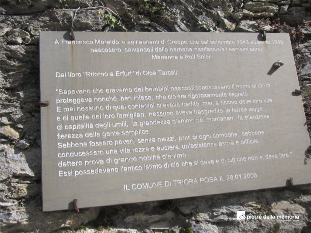 "Nessuno ci aveva tradito, mai, a costo della loro vita e di quelle dei loro familiari. Essi possedevano l’antico istinto di ciò che si deve fare". Come scrive Olga Tarcali nel suo libro Ritorno a Erfurt, durante il periodo delle persecuzioni razziali i Creppesi misero a repentaglio la propria vita per nascondere e proteggere due bambini ebrei, Marianne e Rolf, riuscendo così a salvarli.