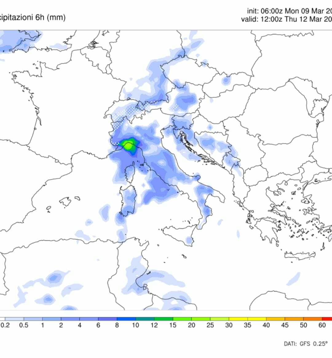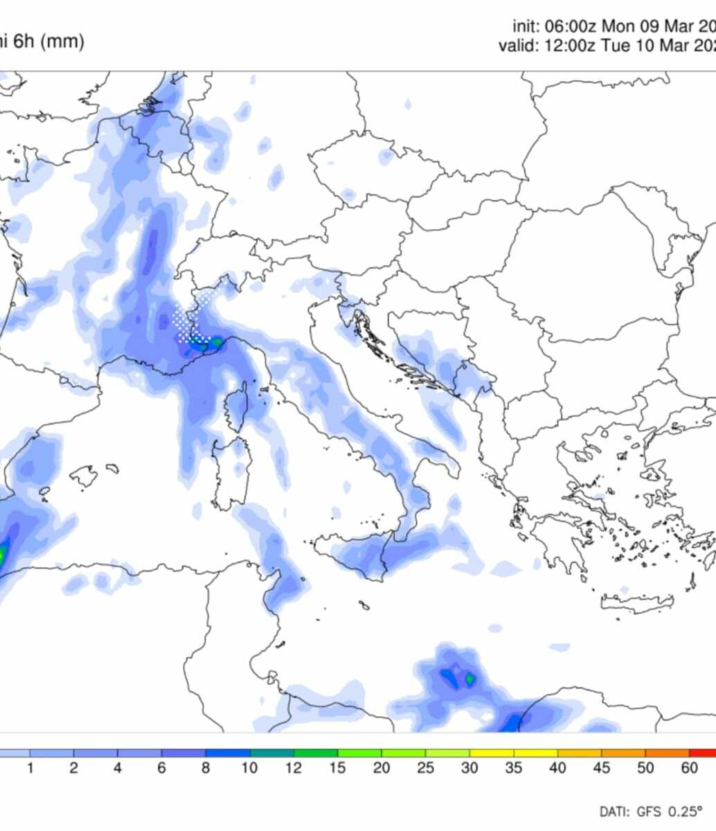 La giornata di giovedì 12 marzo secondo il modello americano GFS. Possibile peggioramento più marcato sul Centro regione, ma scenario ancora da definire