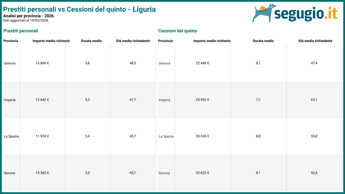 In Liguria, il dato più significativo arriva proprio dal Ponente. La provincia di Imperia registra l’importo medio più alto per le cessioni del quinto, pari a 25.902 euro. All’estremo opposto si colloca La Spezia, con una media di 20.530 euro. Oltre all’importo, Imperia si distingue anche per l’età media dei richiedenti: qui si registra il valore più alto della regione, con 63 anni e 2 mesi. A Genova, invece, si trovano i richiedenti più giovani, con un’età media di 47 anni e 5 mesi. Per quanto riguarda la durata dei finanziamenti, il primato regionale spetta a La Spezia con una media di 8 anni e 8 mesi.