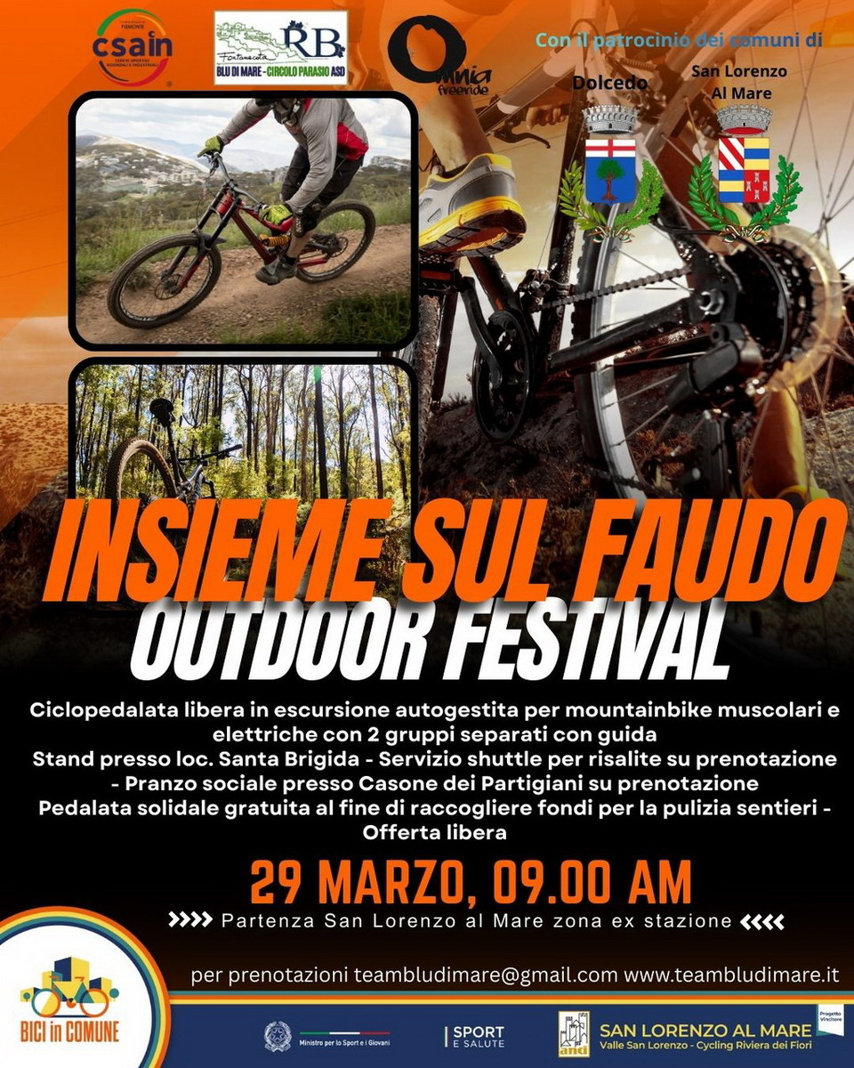 9.00. ‘Insieme sul Faudo’: evento outdoor organizzato da Blu di Mare – Circolo Parasio ASD in collaborazione con CSAIN, nell’ambito del progetto Bici in Comune. Partenza da San Lorenzo al Mare (locandina)
