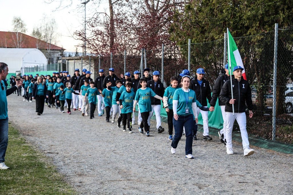 Ad accompagnarle sul diamante i ragazzi della U12 del JFK Mondovì, oltre agli amici dell’AIBXC (Associazione Italiana Baseball Giocato da Ciechi) e dell’associazione Dr-Agon che si occupa di ragazze e ragazzi con disturbi di neurosviluppo.