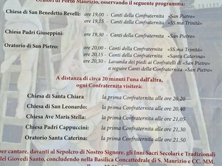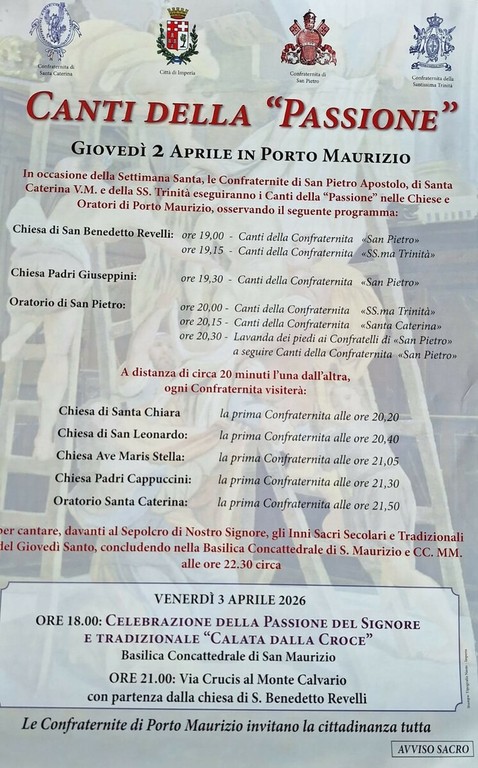 Le Confraternite di Porto Maurizio conservano la memoria di secoli di tradizione con l’antico rito della lavanda dei piedi e i canti di dolore eseguiti davanti ai Sepolcri delle chiese del quartiere. I Miserere, gli Stabat Mater e le laudi penitenziali vengono interpretati dal coro maschile della Confraternita di San Pietro, da quello femminile della Confraternita di Santa Caterina e dal coro misto della Confraternita della Santissima Trinità. Il percorso, che ha inizio dall’Oratorio di San Pietro Apostolo, si snoda attraverso le chiese di Santa Chiara e San Leonardo, raggiunge l’Ave Maris Stella, passa davanti ai Padri Cappuccini in piazza Roma e all’Oratorio di Santa Caterina, per terminare nella Basilica di San Maurizio.
