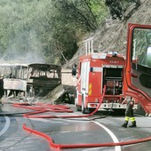 Pieve di Teco, autobus della Riviera Trasporti in fiamme sulla Statale 28 (foto e video)